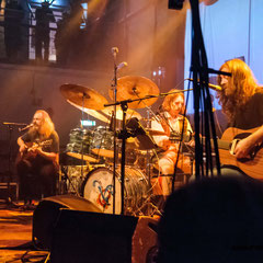 Die langsam ansteigenden Klangwellen durch Bass (teilweise mit Loop gespielt) und zwei Gitarren (Saether spielt eine doppelhälsige Gitarre), Schlagzeug und einer Bastion von Effektgeräten am Boden verursachen derart intensives körperliches und mentales Klangerlebnis, dass ich nach dem ersten Stück etwas benommen in die Runde schaue. Das Publikum liebt es. Es geht auch direkt weiter mit „Sentinals“, einem etwas ruhigeren Stück vom neuen Album, bevor sie eine rockige und harte Version von „Hotel Daedalus“ (auch von „Yay“) spielen, mit weit weniger „Kashmir-Flair“ (Led Zeppelin) als auf dem Studio-Album. Das heutige elektrische Set wartet mit einigen Highlights aus der langen Bandgeschichte auf, etwa „August“ von „Still Life with Eggplant“ (2013), „The Transmutation of Cosmoctopus“ von „Kingdom of Oblivion“ (2021) oder einer sehr heftigen und langen Version von „Starhammer“ von „Heavy Metal Fruit“ (2010). Die Stücke gehen oft ineinander über. Die Band entscheidet scheinbar spontan, in welche Richtung sich die Stücke entwickeln. Ich habe den Eindruck, dass ich mit der Musik verschmelze. Auch jegliches Zeitgefühl ist verloren gegangen. Dieser Zustand wird hervorgerufen durch die Intensität der pumpenden Bassläufe, die sich wiederholenden und doch verändernden psychedelischen Gitarrenriffs, die Eskalationen am Schlagzeug und die wechselnde Untermalung durch die Effektgeräte.